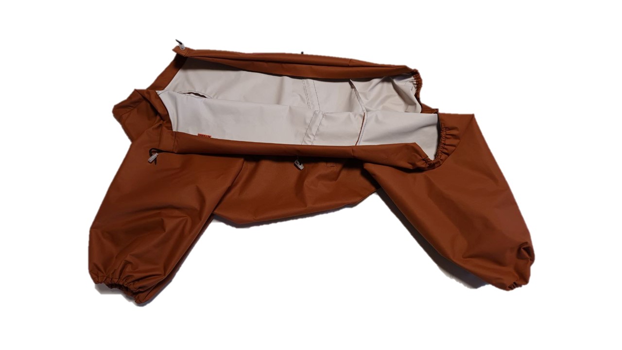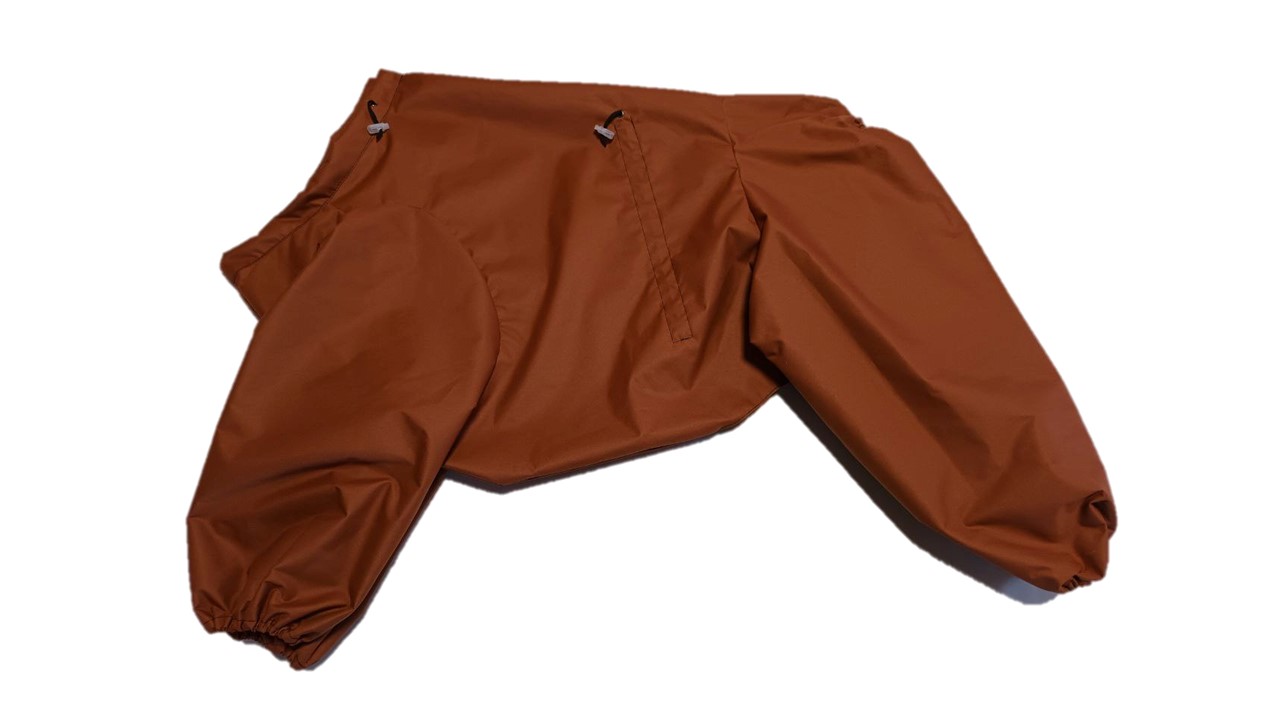 Изделие легко одевается и снимается. Застегивается сверху на спине на кнопки. Имеет возможность регулировки на талии, в вороте и манжетах, что дает возможность питомцам удобно себя чувствовать.