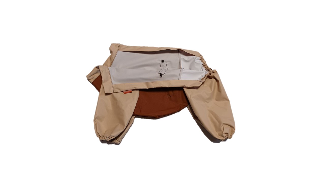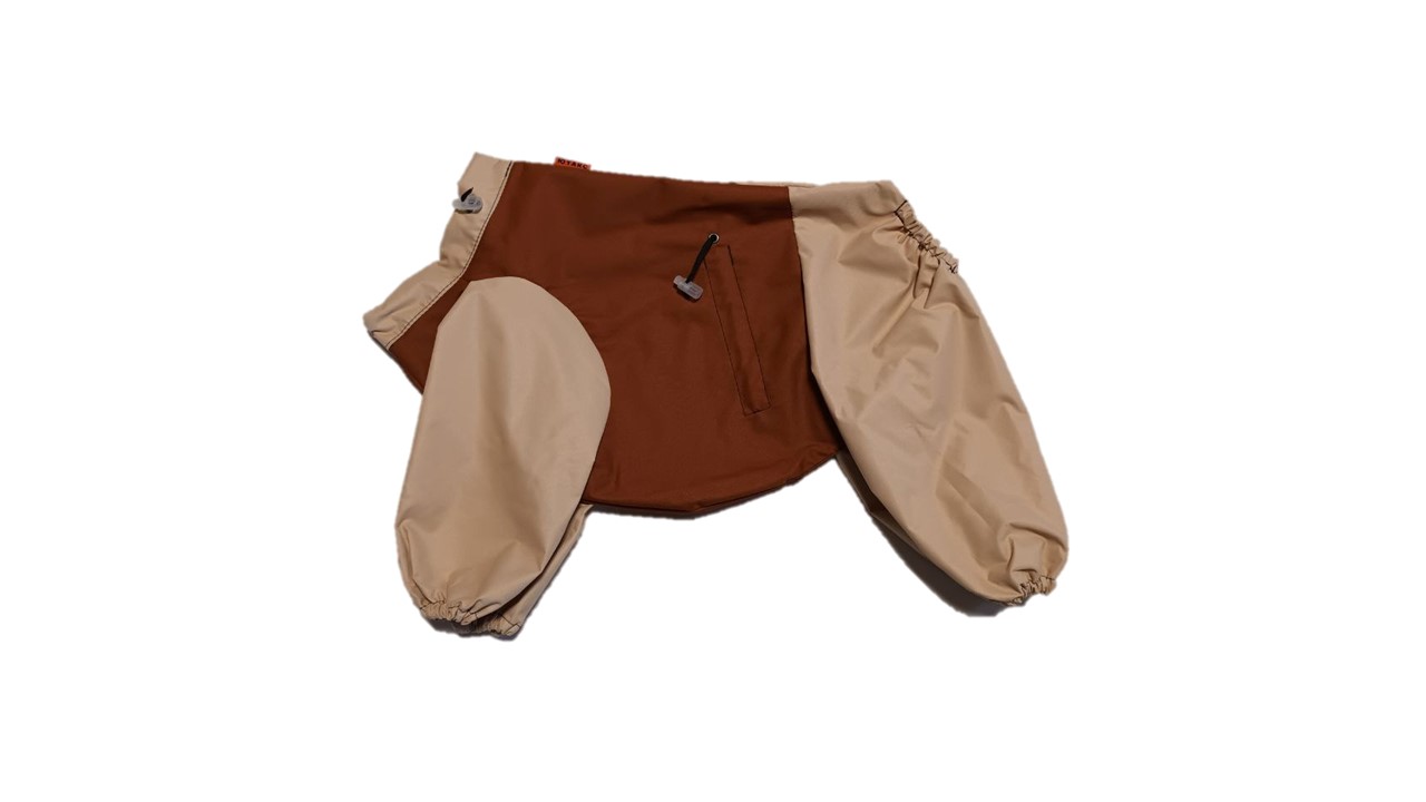 Изделие легко одевается и снимается. Застегивается сверху на спине на кнопки. Имеет возможность регулировки на талии, в вороте и манжетах, что дает возможность питомцам удобно себя чувствовать.